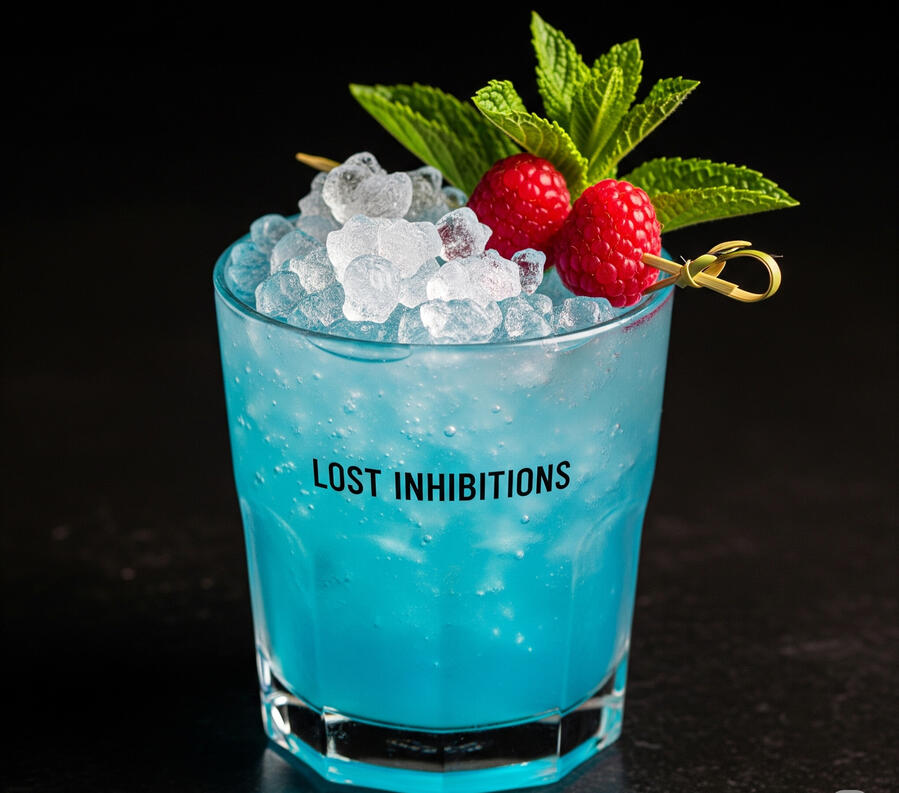 | Lost Inhibitions is the perfect drink to awaken your senses. Made with a smooth dry gin and Sapphire or apple tonic, it brings an exciting balance of botanical sharpness and crisp sweetness. The drink is elegantly served over crushed ice, and garnished with mint and fresh raspberries to add a touch of aromatic freshness. The hue of this cocktail can be a mesmerizing bluish tint, especially when paired with Sapphire, or take on a vibrant green if apple tonic is used, giving it a playful, ever-changing color that’s as intriguing as the experience itself |
