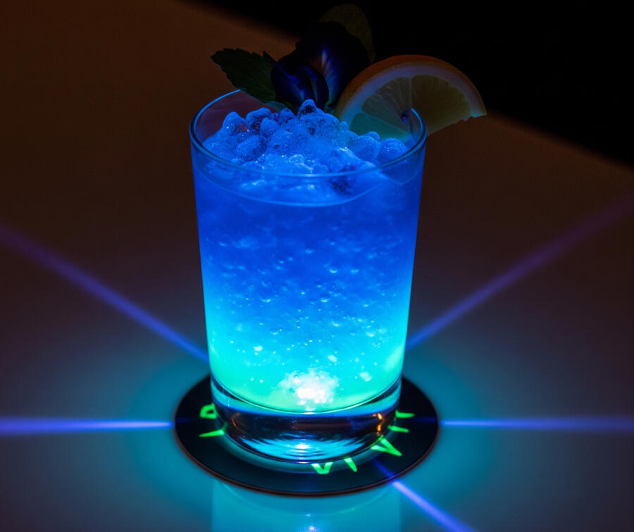 | Between the Sheets is a enchanting, color-changing cocktail is served in a sleek highball glass over crushed tonic ice. Begin with a pour of ginger syrup and fresh lime juice, adding a zesty kick. Next comes the show-stopping butterfly pea-infused vodka, creating a mesmerizing deep blue hue. A pour of tonic water or club soda magically transforms the drink’s color, thanks to the pH-reactive butterfly pea. Served atop a black light coaster, this drink glows under the light, making for a vibrant and unforgettable experience. Both thrilling to the eye and tantalizing to the taste, Between the Sheets is a cocktail like no other. |